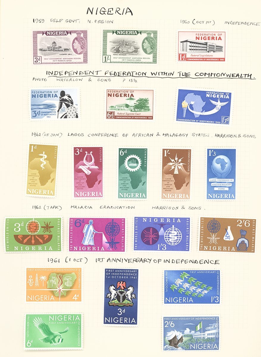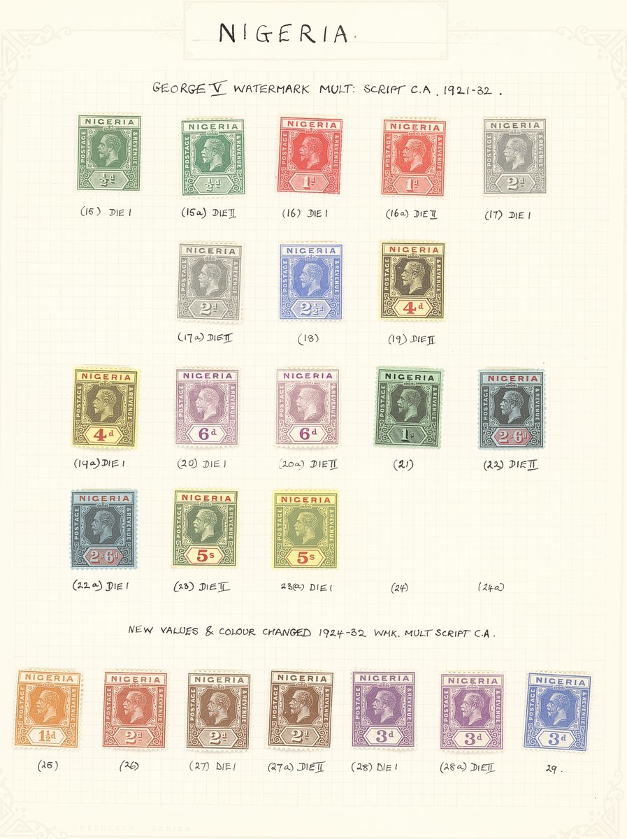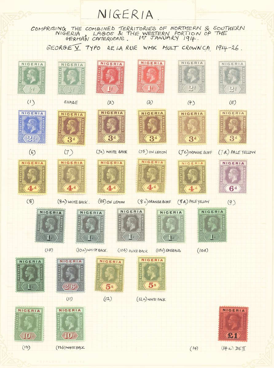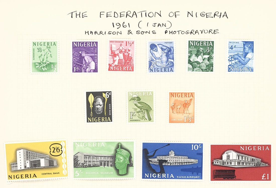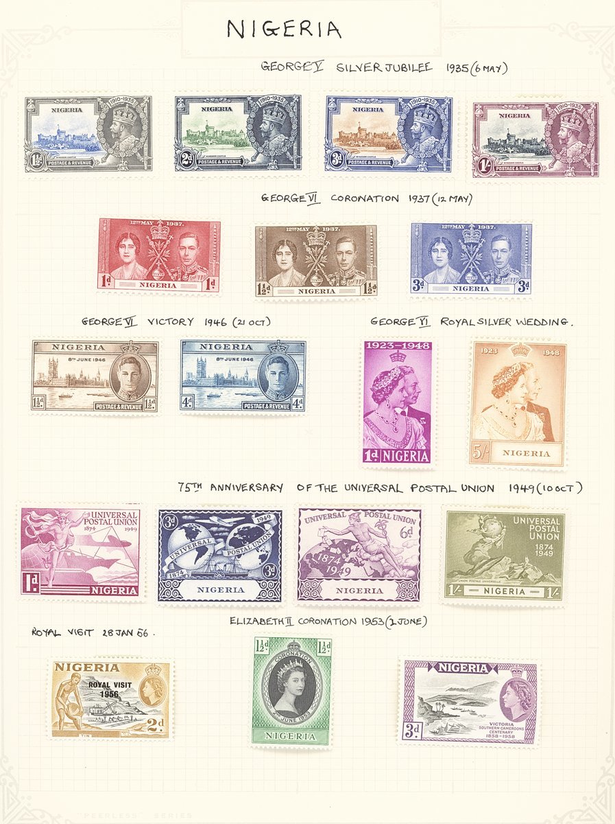 1901-61 mainly mint collection on album pages including Southern Nigeria with 1901-02 set to 10/-, 1903-04 with values to 10/-, 1904-08 values to 5/- and 1912 MCA to 10/-, Nigeria with 1914-29 MCA virtually complete set of thirty to £1 (Die II) including 3d. (5), 4d. (5), 1/- (6), 5/- (2) and 10/- (2), 1921-32 Script to 5/- with a few additional shades, 1936 set to 10/-, 1938-51 set to 5/- including perf variations, 1953 set to £1, etc. Cat. £1,800+