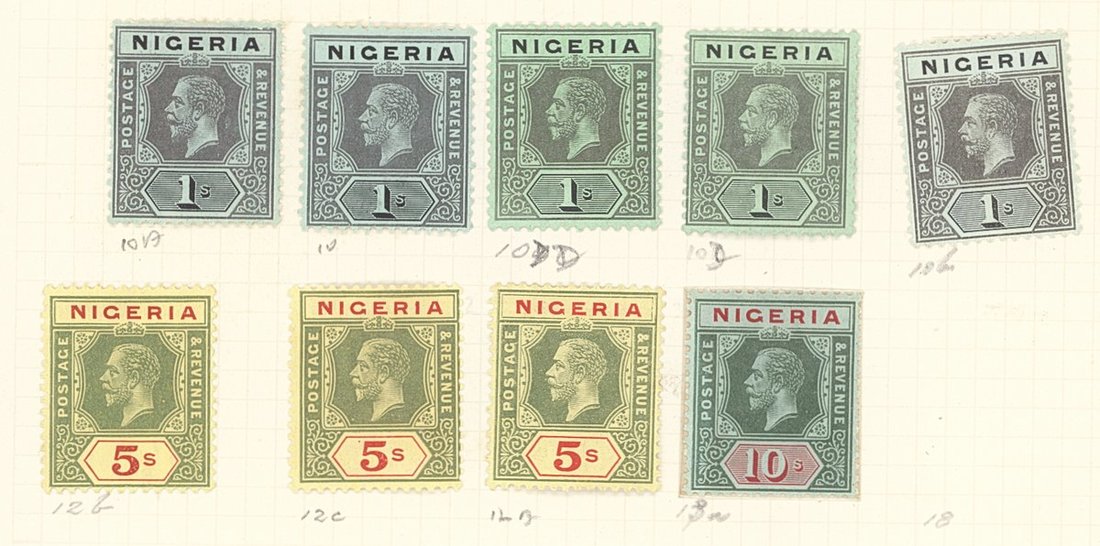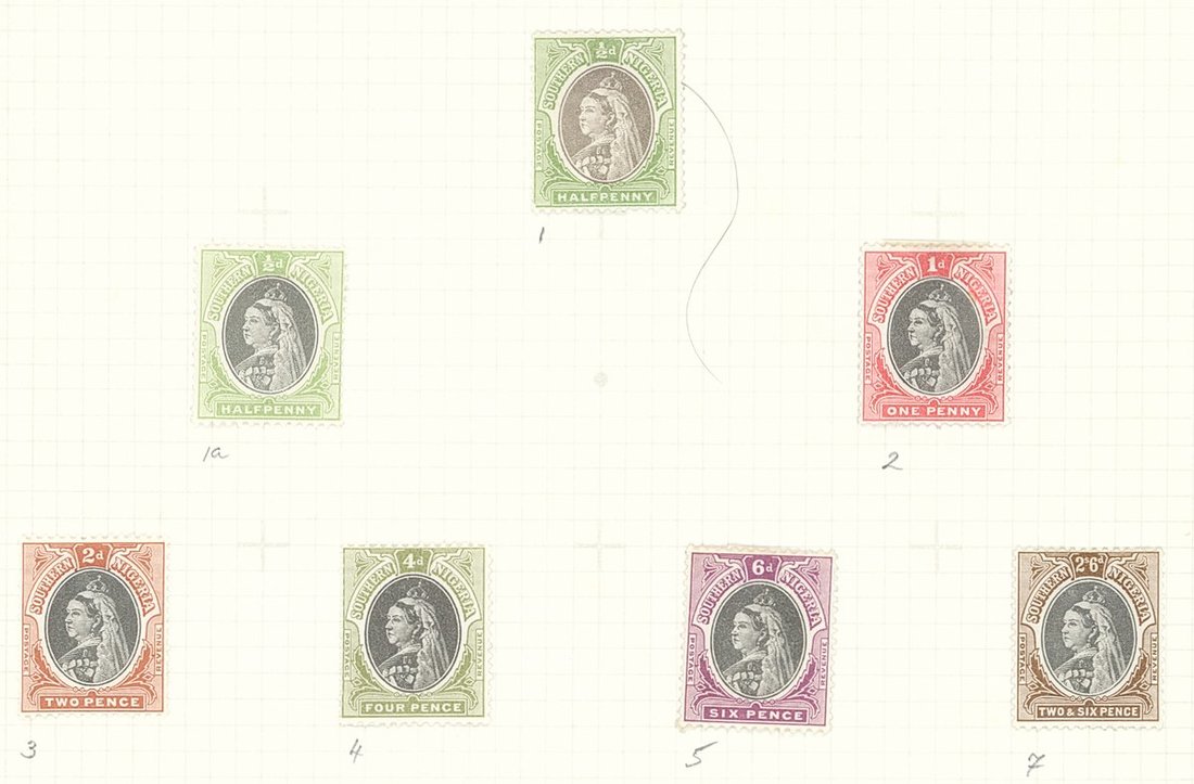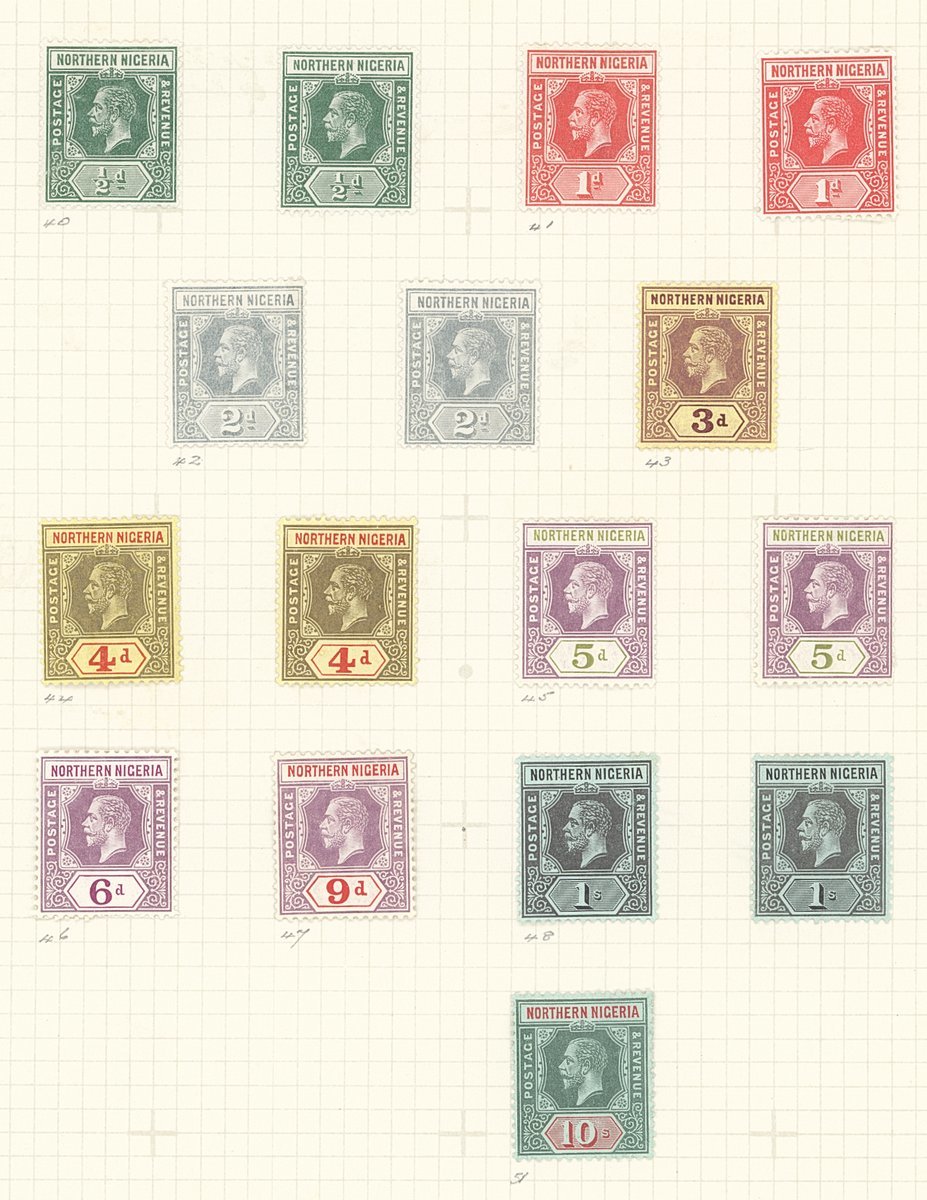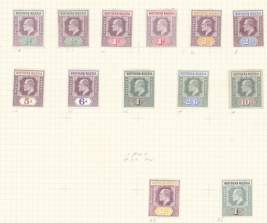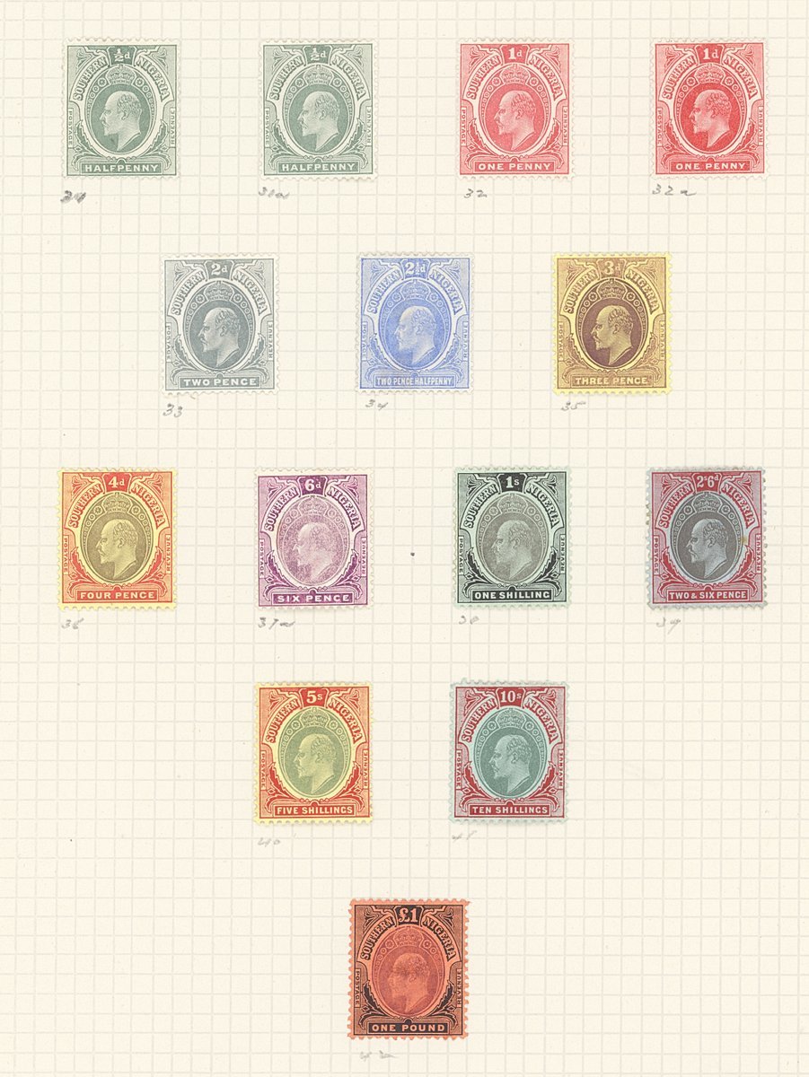 1902-12 mint selection on album pages comprising Northern Nigeria 1902 CA set to 10/-, 1905 MCA 2d. and 1/-, 1910-11 MCA to 1/- and 1912MCA set to 10/-, Southern Nigeria 1901-02 to 2/6d., 1903-04 with values to 1/-, 1904-09 to 5/-, 1907-11 set to £1 and 1912 with value to 5/-, Nigeria with 1914-29 to 10/- (duplication including 5/- (4) and 10/- (2), 1938-51 set to 5/- (duplicated), 1948 Silver Wedding etc. chiefly good to fine