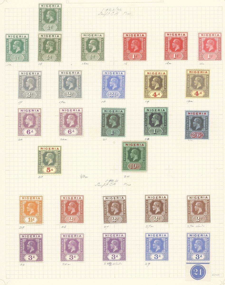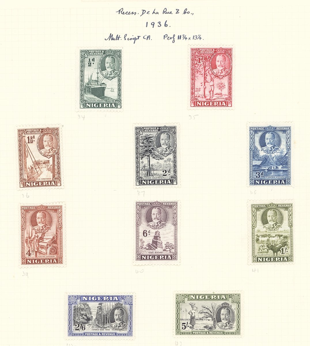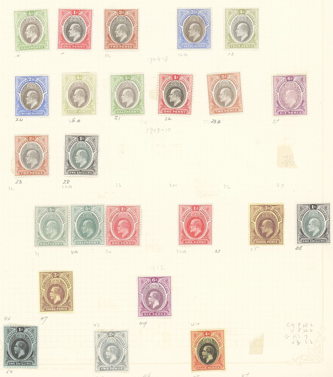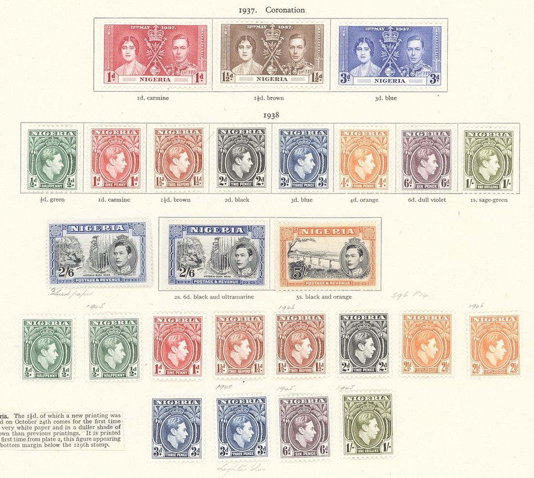 1902-12 mint selection on album pages comprising Northern Nigeria 1902 CA set to 10/-, 1905 MCA 2d. and 1/-, 1910-11 MCA to 1/- and 1912MCA set to 10/-, Southern Nigeria 1901-02 to 2/6d., 1903-04 with values to 1/-, 1904-09 to 5/-, 1907-11 set to £1 and 1912 with value to 5/-, Nigeria with 1914-29 to 10/- (duplication including 5/- (4) and 10/- (2), 1938-51 set to 5/- (duplicated), 1948 Silver Wedding etc. chiefly good to fine