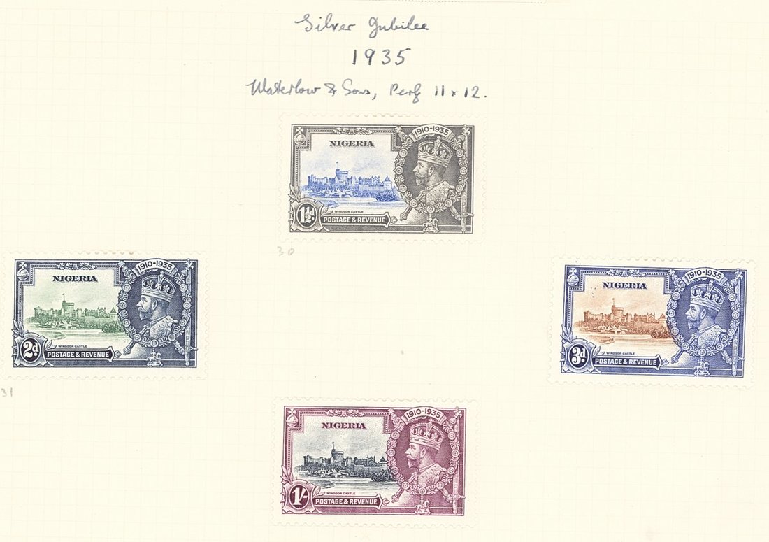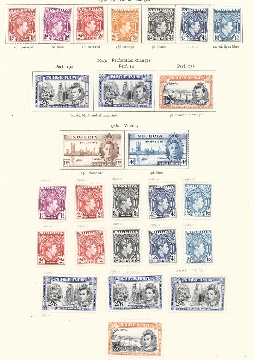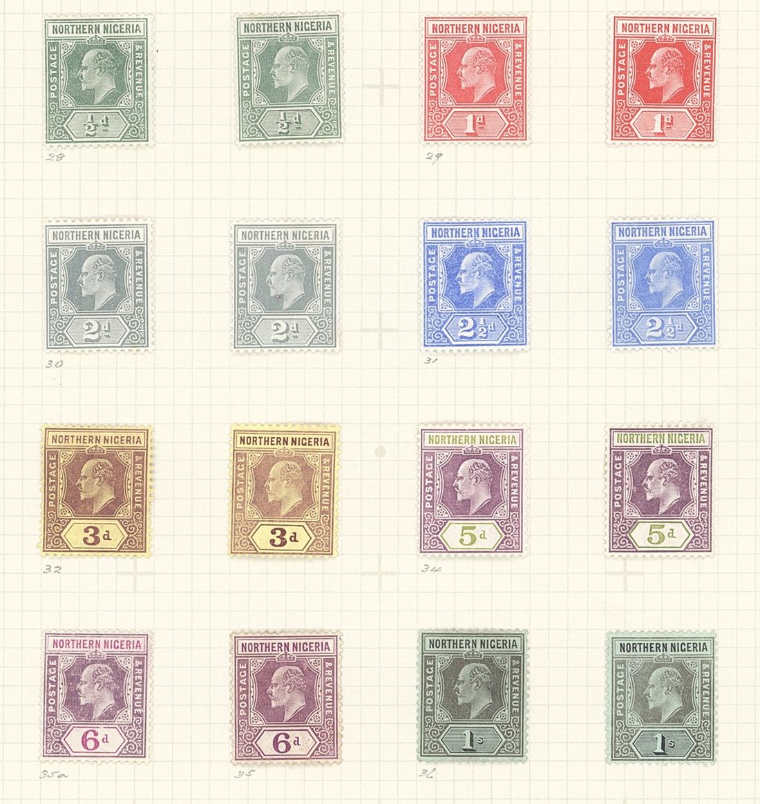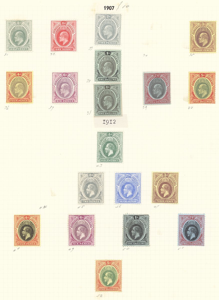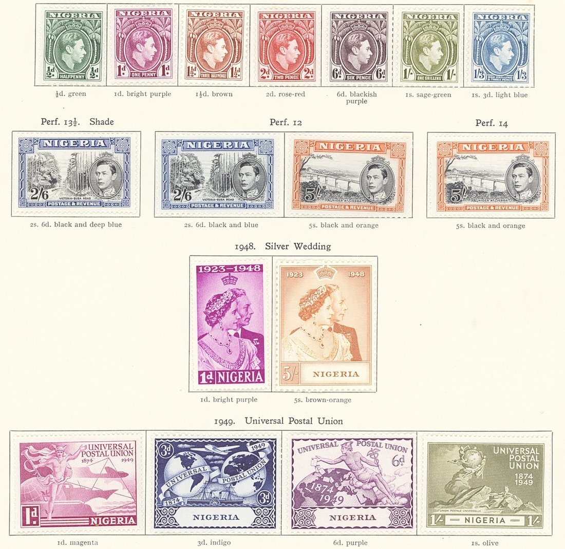 1902-12 mint selection on album pages comprising Northern Nigeria 1902 CA set to 10/-, 1905 MCA 2d. and 1/-, 1910-11 MCA to 1/- and 1912MCA set to 10/-, Southern Nigeria 1901-02 to 2/6d., 1903-04 with values to 1/-, 1904-09 to 5/-, 1907-11 set to £1 and 1912 with value to 5/-, Nigeria with 1914-29 to 10/- (duplication including 5/- (4) and 10/- (2), 1938-51 set to 5/- (duplicated), 1948 Silver Wedding etc. chiefly good to fine