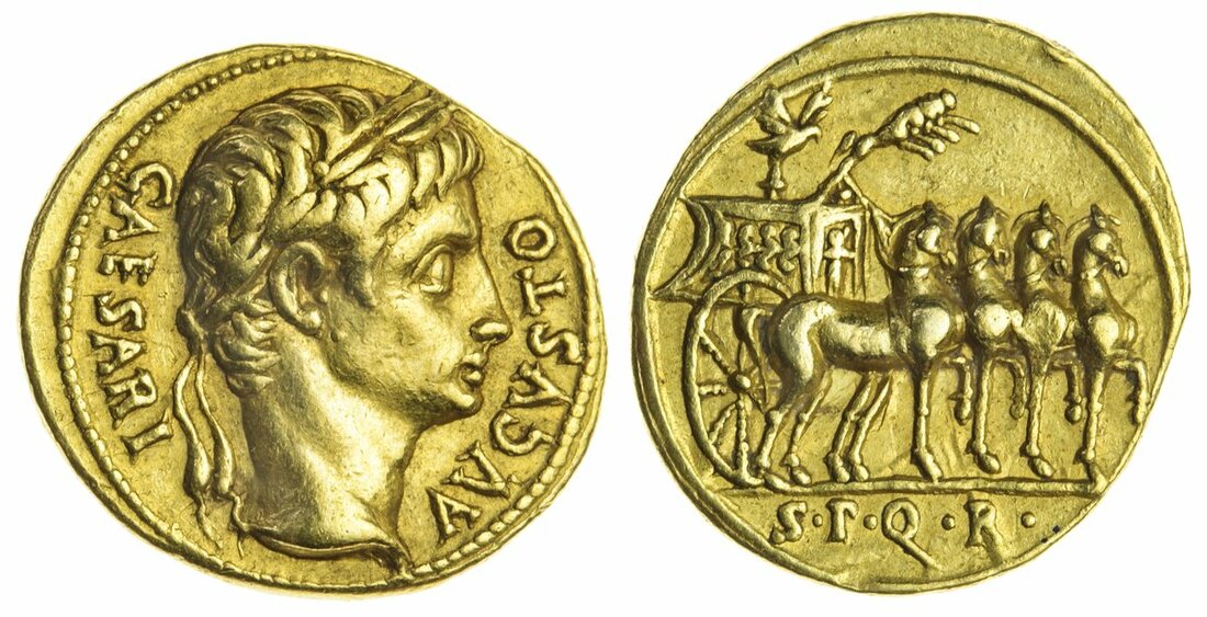 (x) Augustus (27 BC - 14 AD), AV Aureus, 7.84g, 8h,  Uncertain Spanish mint [Colonia Patricia (?)], struck c. 18 BC, CAESARI AVGVSTO, imposing laureate head right, rev. ornamented quadriga right, containing legionary eagle surmounted by four miniature galloping horses, S.P.Q.R. in exergue (BMC 390 var.; Calicó 275a; RIC² 107a), delightfully centred and of competent artistic style, a pleasing very fine, very rare