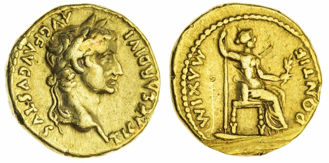 (x) Tiberius, (14-37), AV Aureus, 7.73g, 5h, Lugdunum, TI CAESAR DIVI | AVG F AVGVSTVS, laureate head right, rev. PONTIF MAXIM, Livia [?] as Pax seated right, stool with ornate legs (BMC 30; Calicó 305; RIC I (2), no. 29), aggressively filed in reverse exergue and other surface marks suggestive of past testing or mounting, otherwise a trace of surface lustre, struck details a bolder fine, scarce