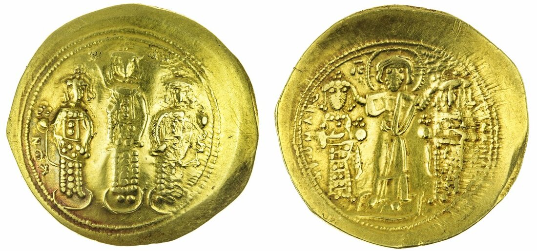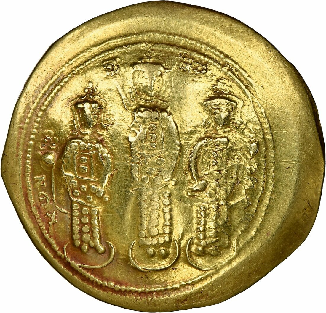 Romanus IV Diogenes, with Eudocia, Michael VII, Constantius, and Andronicus (1068-1071), AV Histamenon Nomisma, 4.34g, 6h, Constantinopolis, Christ standing facing on footstool, wearing nimbus cross, crowning Romanus left, Eudocia on right, IC-XC in upper field rev. Michael in centre, Constantius standing left, Andronicus standing right, all beardless and wearing loros, Michael holding labarum and akakia, his brothers each hold a cross on globe and akakia (Sear 1860; DOC 2), good fine, albeit struck with rusty dies