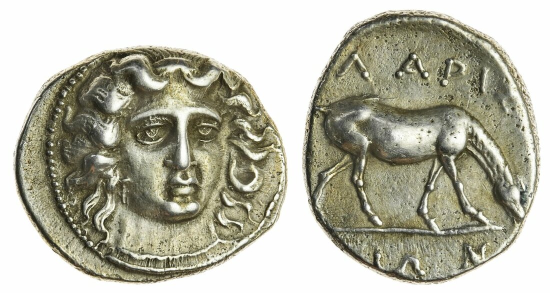(x) Thessaly, Larissa (c. 4th Century BC), AR Drachm, 5.97g, 9h, head of the nymph Larissa three quarters facing right, rev. horse grazing right (SNG Munich 72; Lorber, SNR 79, pl. l. 3), well centred, a really good very fine
