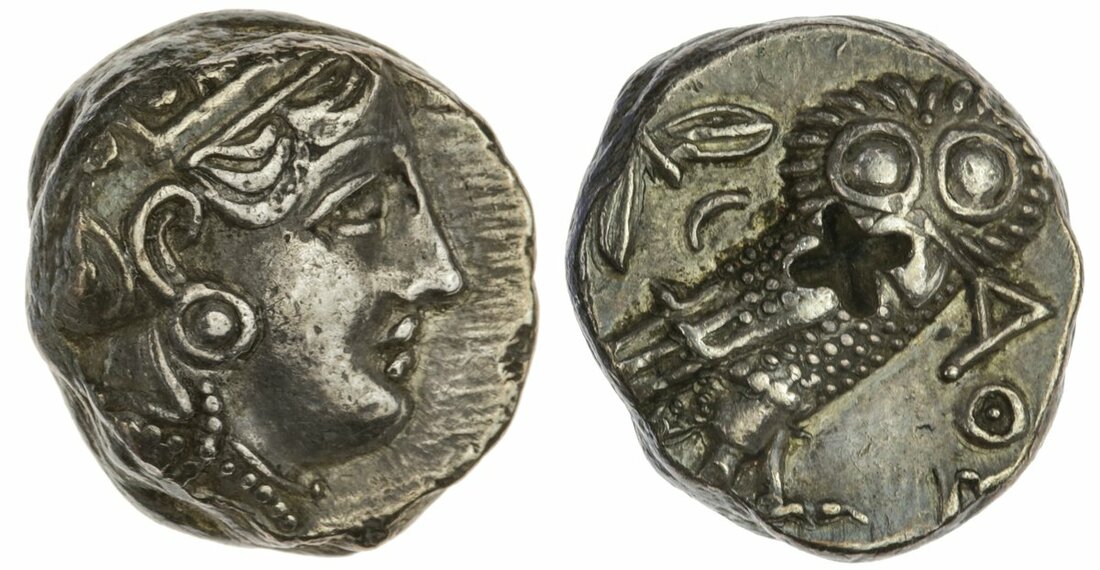 Attica, Athens (454-404 BC), AR Tetradrachm, helmeted head of Athena right, archaic features, rev., Owl, AOE and sprig all in incuse square (Kroll 8; HGC 4, 1597), small chunky flan, countermarked punched into owl, otherwise toned very fine