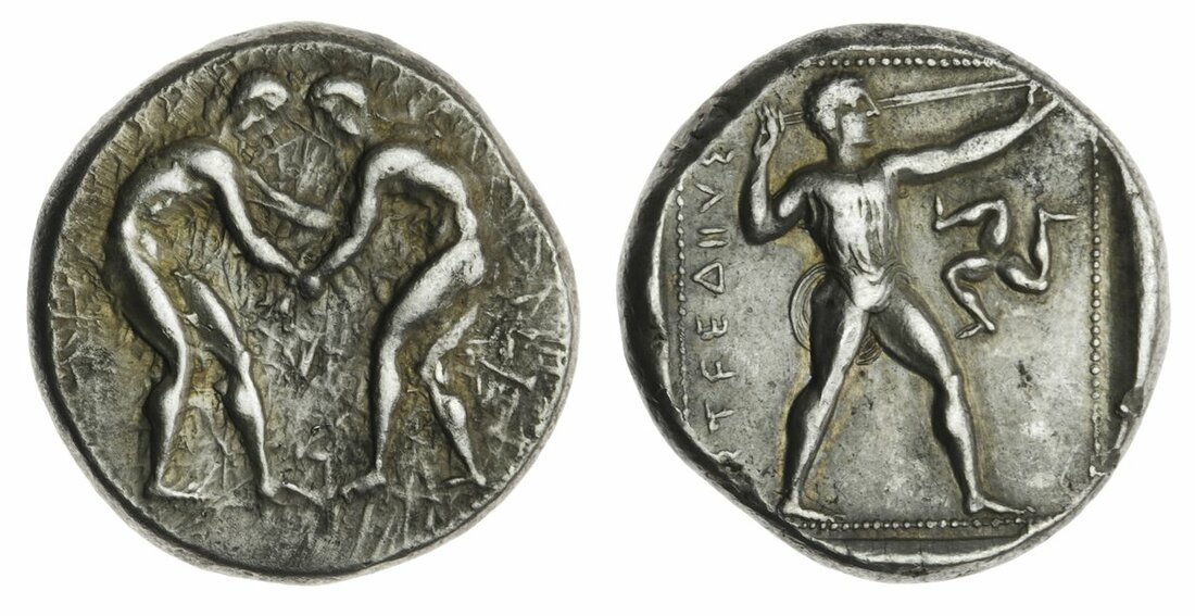 Pamphylia, Aspendos (c. 420-320 BC), AR Stater, 10.85g, two naked wrestlers, rev. slinger right, triskelion in field, magistrate's name to left (SNG BN 54), lightly toned, a pleasing very fine