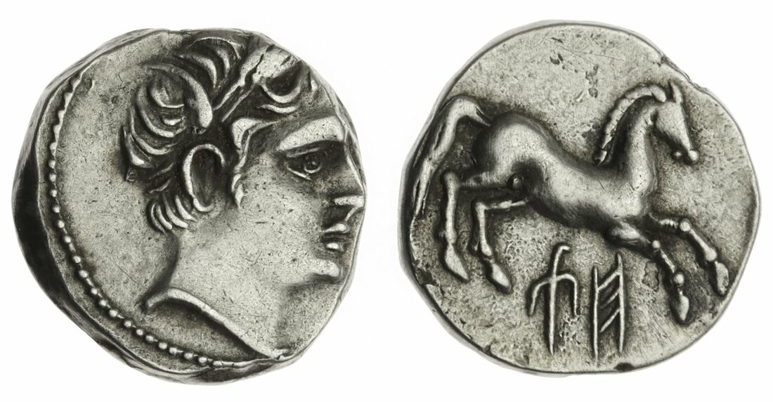 Sicily, Carthaginian Issues, Second Punic War, temp. Hannibal (213-211 BC), AR Quarter-Shekel, 2.04g, 12h, Military mint at Akragas [?], male head right, wearing grain ears, rev. horse galloping right, punic letter "HT" below (Enna Hoard, SNR 62 [1983], pp. 12, nos. 148-52; Burnett 148; SNG Copenhagen 379), the obverse slightly off-struck and with bright surfaces, a bolder very fine