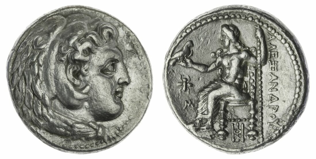 Macedon, Alexander III 'the Great' (336-323 BC), AR Tetradrachm, 16.99g, Babylon, Late Lifetime issue, struck, c. 325-323 BC, under Stamenes or Archon, head of Herakles right, wearing lion pelt, rev. Zeus Aetophoros seated left, holding sceptre, bee and M in left field, monogram below (Price 3619), bright surfaces, a bolder very fine
