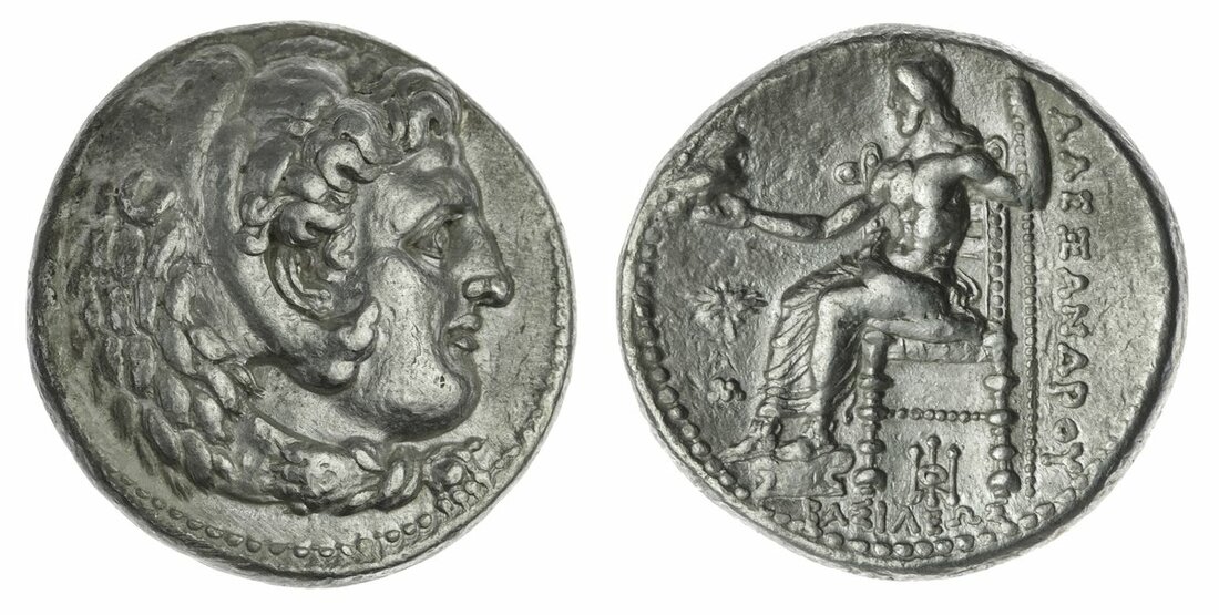 Macedon, Alexander III 'the Great' (336-323 BC), AR Tetradrachm, 17.02g, Babylon, Late Lifetime issue, struck, c. 325-323 BC, under Stamenes or Archon, head of Herakles right, wearing lion pelt, rev. Zeus Aetophoros seated left, holding sceptre, flowerburst and M in left field, monogram below (Price 3680), bright surfaces, a bolder very fine
