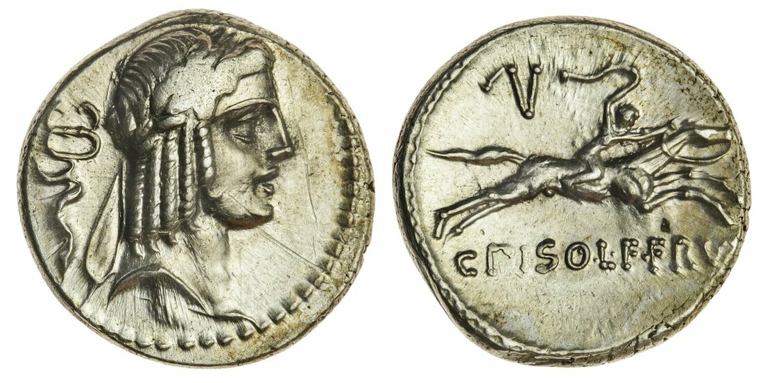 (x) Roman Republic, C. Piso Frugi (67 BC), AR Denarius, 3.80g, 4h, Rome, head of Apollo right, snake entwined around caduceus behind, rev. horseman galloping right, holding whip, V above, C. PISO L.F. FRV[G] below (C A Hersch [NC, 1976], pp. 28, no. 16 (dies O-5/R-1012 ~ three listed); Sydenham 865f; RRC 408/1a; RSC Calpurnia 24), some flatness on hair and light scratch in bright fields, otherwise about extremely fine, rare