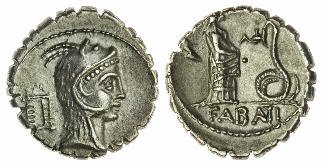 (x) Roman Republic, L. Roscius Fabatus (64 BC), AR Denarius, 3.71g, 6h, Rome, head of Juno Sospita right, harrow behind, rev. maiden and snake facing, FABATI in exergue (RRC 412/1; Sydenham 915; RSC Roscia 3), struck a little off-centre, nevertheless a charming example, lightly toned, extremely fine