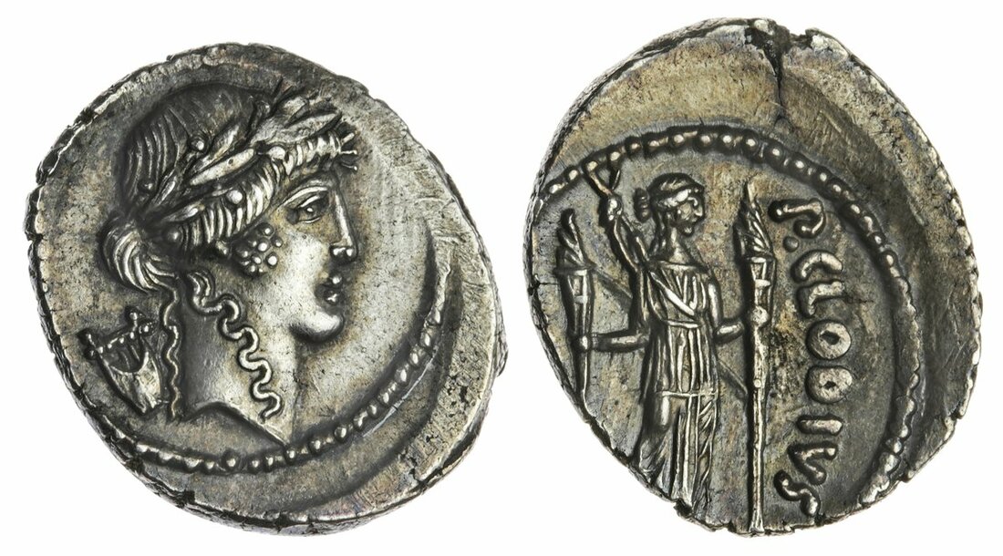 (x) Roman Republic, P. Clodius (42 BC), AR Denarius, 3.70g, 8h, Rome, laureate head of Apollo right, lyre behind, rev. P.CLODIUS [M.F.], Diana standing facing, head right, bow and quiver over shoulder, holding long torch in each hand (RRC 494/23; Syd 1113; RCV 492; RSC Claudia 15), reverse struck off centre with resultant superficial striking split to flan, otherwise attractively toned and of good metal, near extremely fine