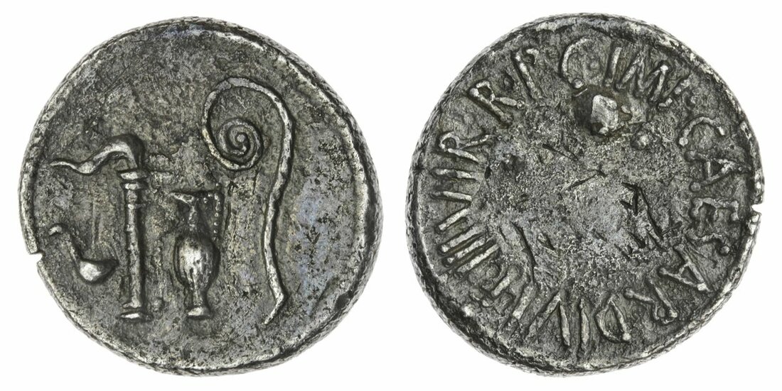 (x) Roman Imperatorial, Octavian (37 BC), AR Denarius, 2.79g, 1h, Mint moving with Octavian, Southern or Central Italy, pontifical implements (simpulum, aspergillum, jug and lituus), rev. IMP • CAESAR • DIVI • F • III VIR • R • P • C (BMC [Gaul] 113-114; RRC 537/1; Sydenham 1332; Sear, Imperators 310; RSC 128), some metal stressing, porosity and die cudding to reverse, otherwise pleasingly centred with a uniform tone, about very fine, very rare