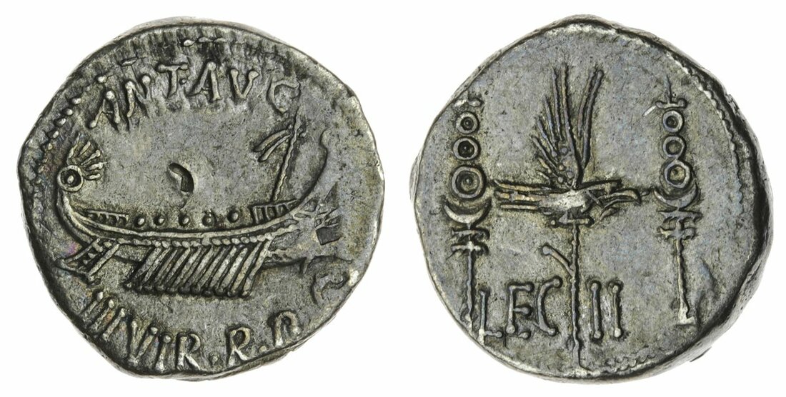 (x) Roman Imperatorial, M. Antonius (32-31 BC), AR Denarius, 'LEGIO II AVGVSTA', 3.69g, 5h, Mint moving with Antonius (Patrae [?]), ANT AVG above, galley right, III VIR R P C below, rev. aquila between two Legionary standards, LEG II below (RRC 544/14; Sydenham 1216; RCV 1479), banker's mark in obverse field, toned, a bold very fine