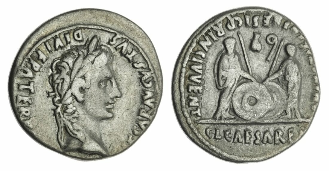 Augustus (27 BC - AD 14), AR Denarius, 2h, Lugdunum, struck 2 BC - AD 4, [CAE]SAR AVGVSTVS DIVI F PATER P[ATRIAE], laureate head of Augustus to right rev. AVGVSTI F COS DESIG PRINC IVVENT, Gaius and Lucius Caesares standing facing with two round shields and two spears between them, simpulum and lituus above, CL CAESARES in exergue (RIC I² 207; BMC 519; BN 1651; Cohen 43; RSC I 43), obverse slightly off-struck, otherwise almost very fine