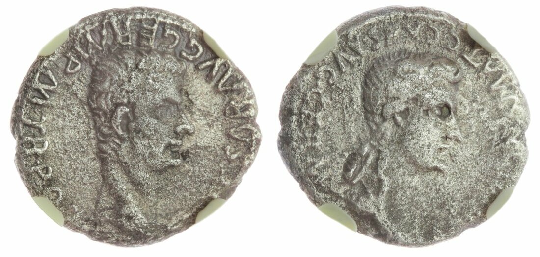 Caligula, with Agrippina (37-41), AR Denarius, 3.15g, 1h, Lugdunum, bare head of Gaius right, rev. draped bust of Agrippina right (RIC I 8; Lyon 162; RSC 4), rough surfaces, barely fine but very rare, in NGC Ancients holder, graded VF. Strike 4/5. Surface 1/5 ~ Corroded (Cert. #2416387-001)