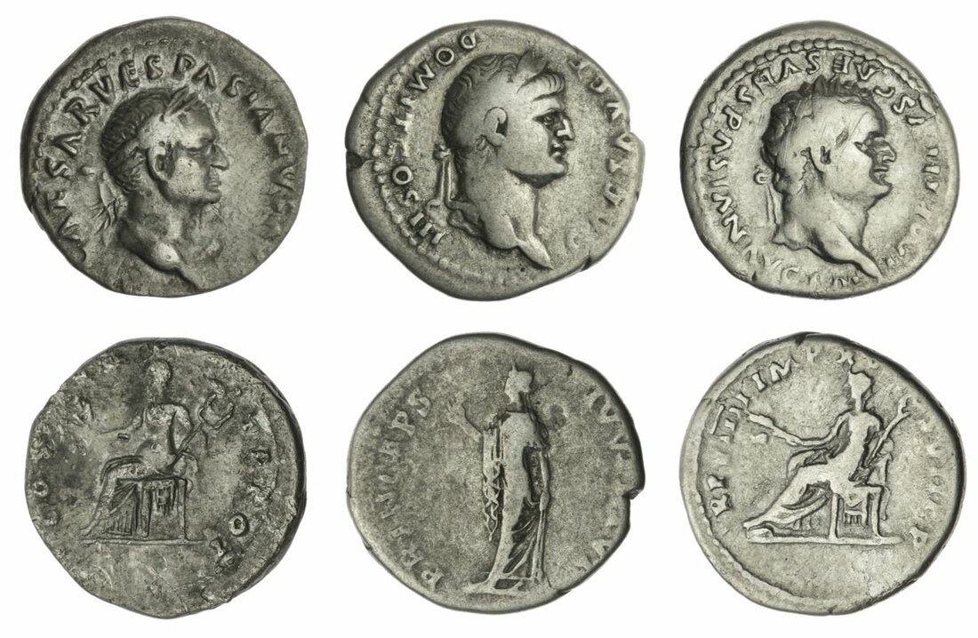 Flavian Dynasty, AR Denarii, Rome (3), Vespasian (69-79), 6h, struck January - June AD 70, rev. COS[ITER] TR POT, Pax seated left, holding branch and caduceus (RIC 29); Titus (79-81), 5h, struck AD 79, rev. TR P VIIII IMP XV COS VII P P, Ceres seated left, holding wheat ear, poppy and torch (RIC I² 40); lastly, Domitian, as Caesar (81-96), 6h, struck AD 76, rev. PRINCEPS IVVENTVT, Spes standing left with flower and raising skirt hem (RIC 788 [233]; BMC 156; RSC 375; RCV 2640), the first with rougher surfaces, otherwise fine to about very fine (3)