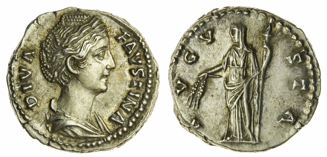 (x) Diva Faustina Senior (died 141), AR Denarius, 3.85g, 5h, Rome, DIVA - FAUSTINA, diademed and draped bust right, rev. AVGV-STA, Ceres standing left, holding corn ears and torch (BMC 408; Strack 474; RIC [Pius], 360; RSC 78), delightfully centred, and the obverse in high relief, about extremely fine