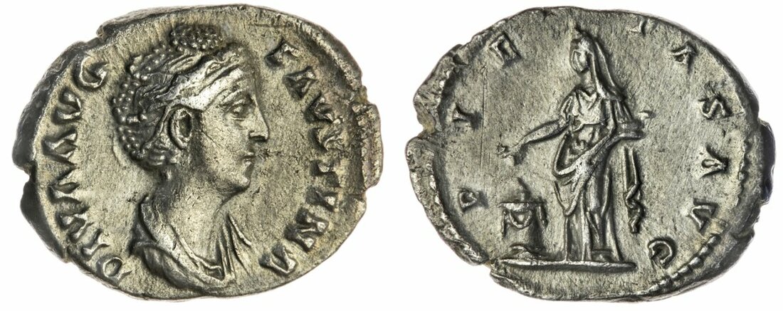 (x) Diva Faustina Senior (died 141), AR Denarius, 6h, Rome, DIVA AVG FAVSTINA, diademed and draped bust right, rev. PIETAS AVG, Pietas standing left, holding patera over altar (BMCRE 311; RIC 394a; Cohen 234; RSC 234; RCV 4598), toned, good very fine