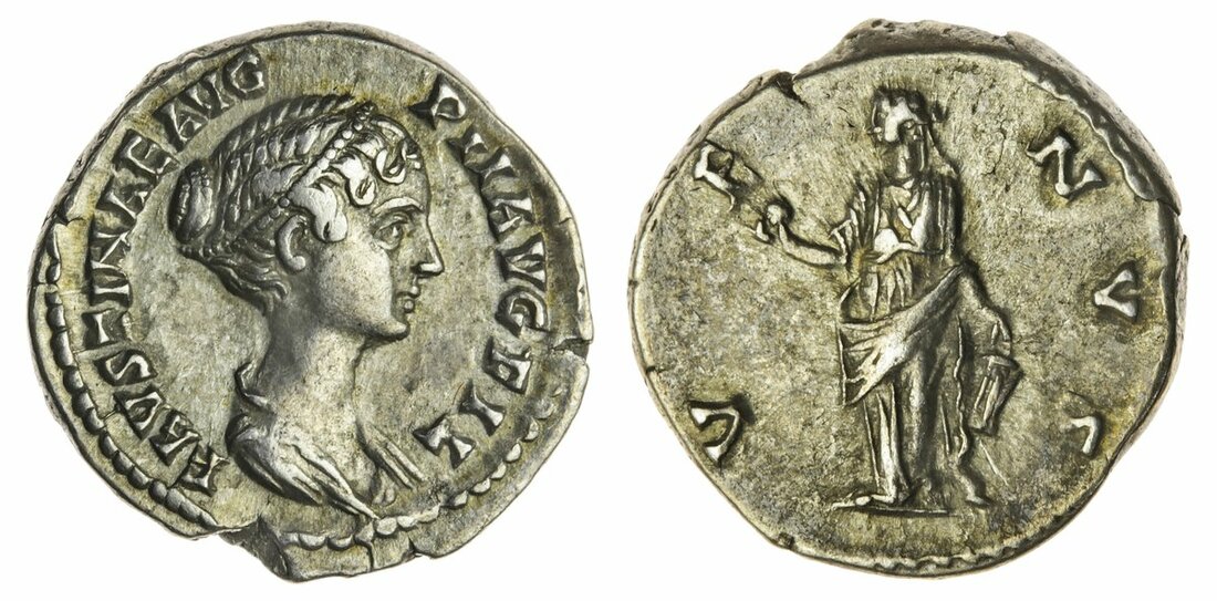 (x) Faustina II Junior, wife of Marcus Aurelius, AR Denarius, 3.38g, 6h, Rome, struck AD 147-150, FAVSTINAE AVG PII AVG FIL, diademed and draped bust right, rev. VENVS, Venus standing left holding apple and dolphin-entwined rudder (RIC [Pius] 517a; RSC 266a), some minor flan splitting, otherwise a pleasing coin, good very fine, scarce