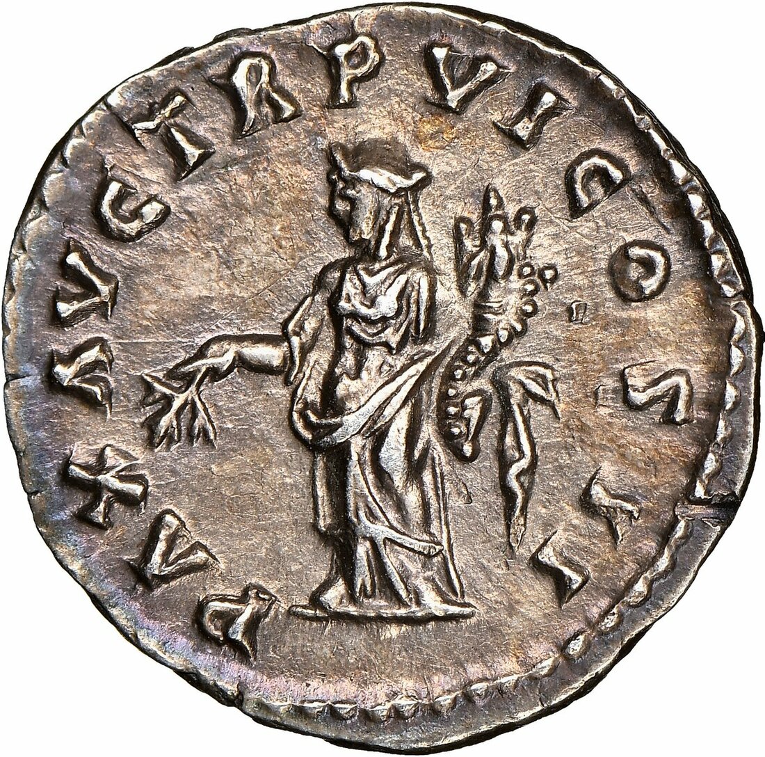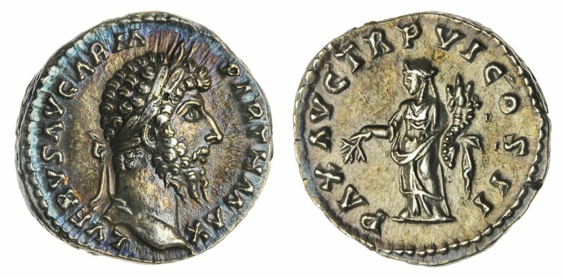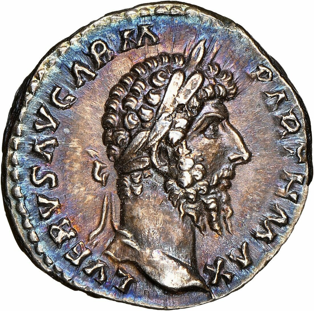 (x) Lucius Verus (161-169), AR Denarius, 3.02g, 6h, Rome, struck, AD 165-166, L VERVS AVG ARM PARTH MAX, laureate head right, rev. PAX AVG TR P VI COS II, Pax standing left, holding olive branch and cornucopiae (bmc 420; RIC 555; RSC 127), stunning rich cabinet tone with iridescent blue peripheries framing ochre-red fields around portrait, a trace of rub to high points otherwise beautifully centred, almost extremely fine, scarce in this condition