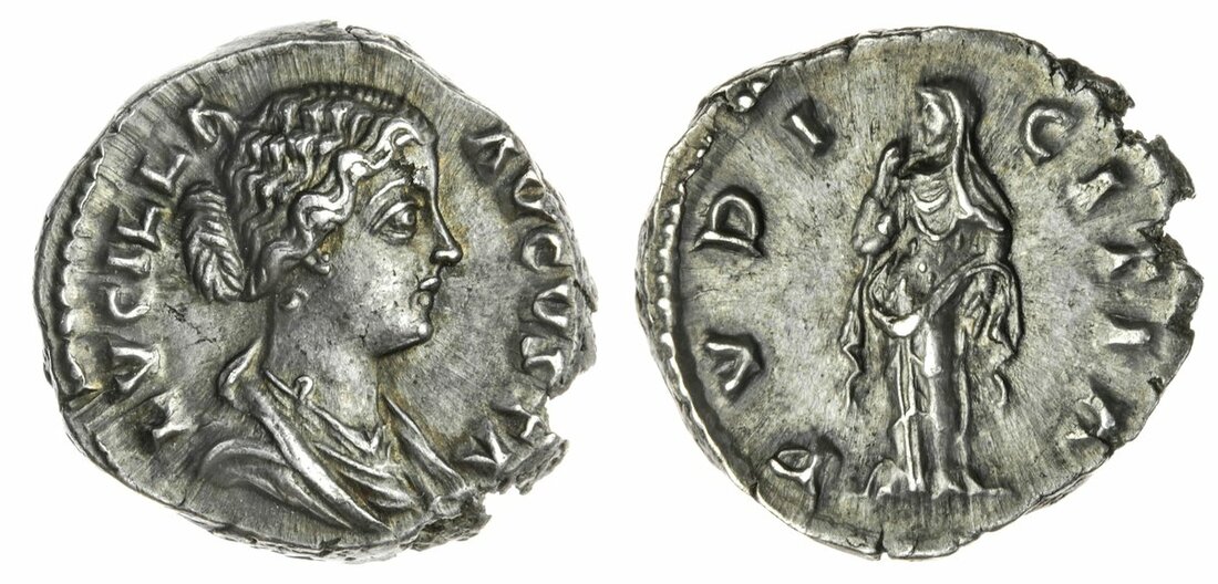 (x) Lucilla, wife of Lucius Verus (164-169, † 181), AR Denarius, 3.59g, 6h, Rome, struck c. AD 167-168, LVCILLA AVGVSTA, draped bust right, rev. PVDICITIA, Pudicitia standing, veiled, head left (BMC 348; RIC 780; RSC 60), some striking splits, otherwise attractive dark tone over high relief details, a pleasing coin, near extremely fine, and rare with only 13 recovered from the Reka-Devina hoard