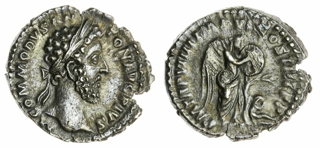 (x) Commodus (177-192), AR Denarius, 3.05g, 6h, Rome, struck AD 183-184, M COMMODVS AN-TON AVG PIVS, laureate head right, rev. P M TR P VIIII IMP VI COS IIII P P, Victory standing right, inscribing shield set on tree, seated captive below (BMC 127; RIC 79; RSC 438), the flan with striking splits, otherwise darkly toned, extremely fine / very fine