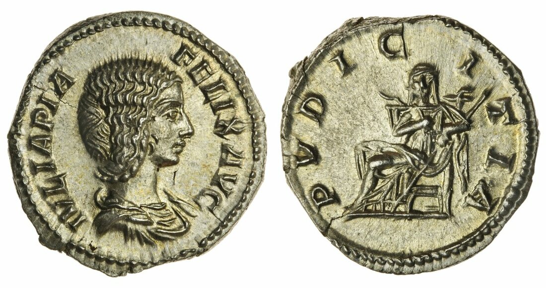 (x) Julia Domna, wife of Septimus Severus, AR Denarius, 2,78g, 7h, Rome, struck AD 211-217, IVLIA PIA FELIX AVG, draped bust right, rev. PVDICITIA, Pudicitia seated left, hand on breast and holding sceptre (BMC 19; RIC [Caracalla] 385; RSC 165; Severer 1298), a beautifully choice example, about mint state