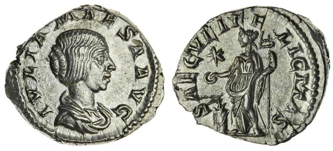 (x) Julia Maesa (218-223 or 226), AR Denarius, 3.50g, 7h, Rome, struck c. AD 220-222, IVLIA MAESA AVG, draped bust right, rev. SAECVLI FELICITAS, Felicitas standing left, holding long caduceus and patera to sacrifice over lighted altar, star in left field above (BMC 81; RIC 272; RSC 45b), lustrous, about extremely fine