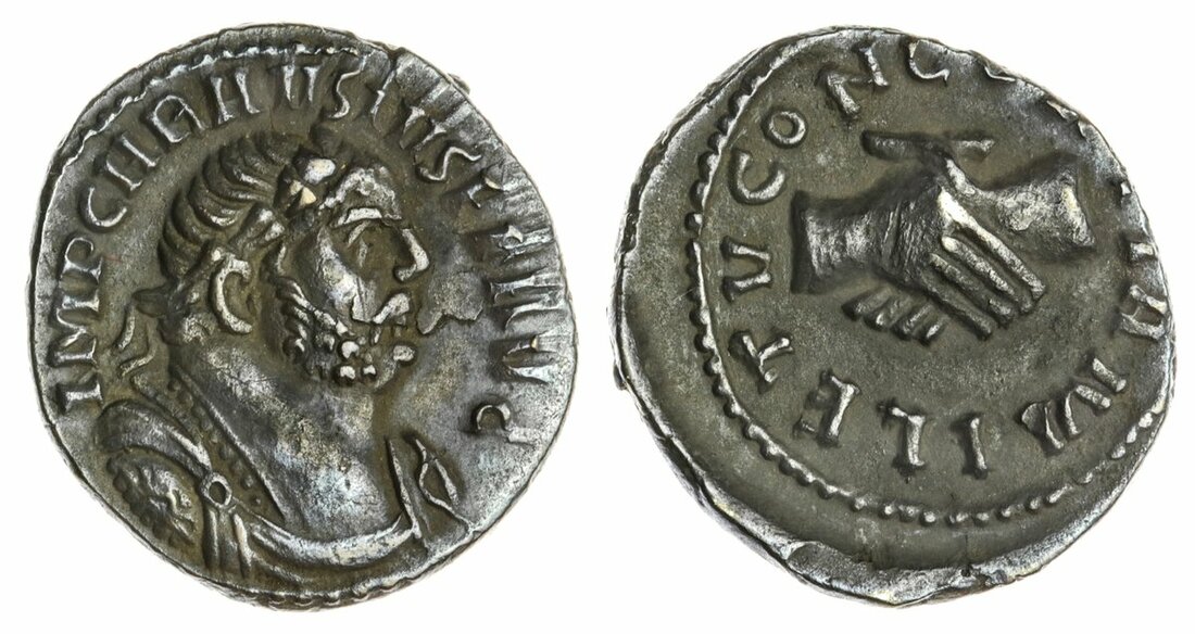 (x) Carausius (286-293), AR Denarius, 3.37g, 2h, Londonium, IMP CARAVSIVS P F AVG, laureate, draped and cuirassed bust right, rev. CONC[ORD]IA MILETV, clasped hands, no mint mark (cf. RIC 543 ff var,), the reverse somewhat off-struck, otherwise with a rich dark cabinet tone, extremely fine, rare and highly sought after