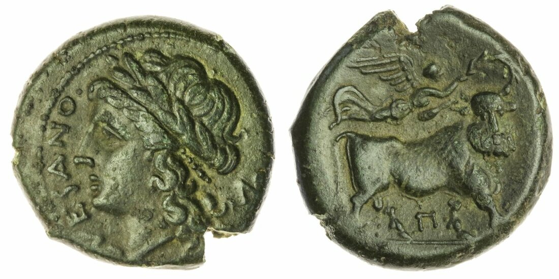 Campania, Suessa Aurunca (265-240 BC), Æ 19mm., laureate head of Apollo left, [S]VESANO before, rev. man-headed bull walking right, Nike flying right above, placing wreath on bull's head (MIAMG 969 (R); HN Italy 450; SNG ANS 604; SNG France 6), split in flan, otherwise a rich green patina, a bolder very fine