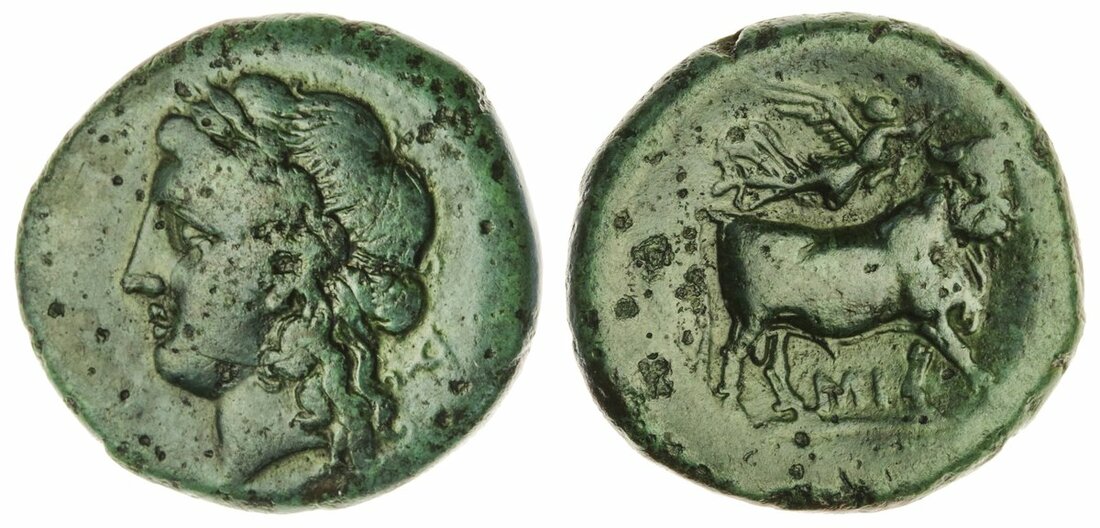 Campania, Neapolis (275-250 BC), Æ Litra, 18mm., laureate head of Apollo left, A behind, rev. man-headed bull right, Nike flying above crowning head, MI below (BMC pp. 115, no. 226; HN Italy 589), rubbed and patinated, good fine