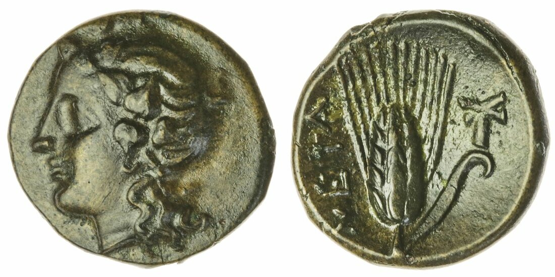 Lucania, Metapontion (c. 300-250 BC), Æ 16mm, head of Dionysos left, rev. grain ear with bud, META to left, crossed torch to right (BMC pp. 264, no. 202.; Johnston, 'The Bronze Coinage of Metapontum', 47; HN Italy 1683; SNG ANS 590), rich dark patina with minor spots of verdigris to reverse, otherwise good very fine, a handsome example