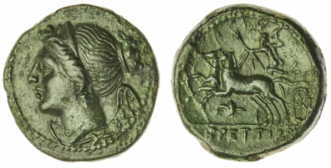 Bruttium, The Brettii (214-208 BC), Æ Half-Uncia (Triobol), 17mm., winged and diademed bust of Nike left, thunderbolt below, rev. Zeus, holding thunderbolt and sceptre, driving biga left, bunch of grapes below, BRETT[IWN] in exergue (Scheu 46; HN Italy 1989; SNG ANS 112), rich dark patina with only occasional roughness, good very fine