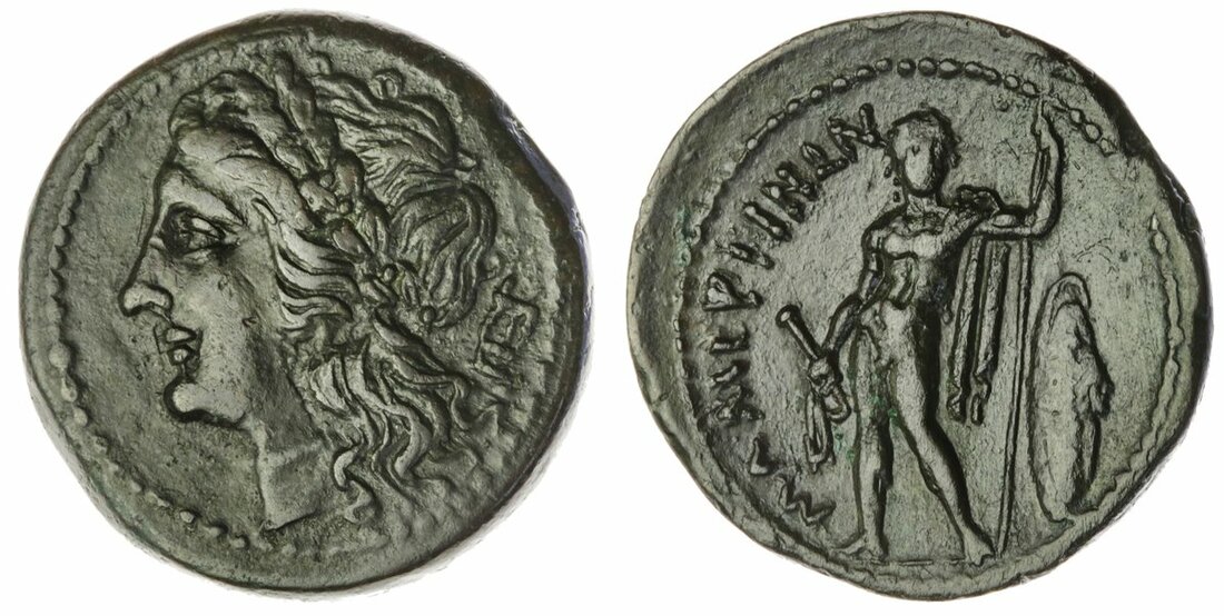 Sicily, Messana Mamertini Pentonkion (pre 282 BC), Æ 26mm., laureate head of Apollo left, lyre behind, rev. warrior standing facing, holding spear, shield in right field (Mont. 4475; SNG Copenhagen 449; SNG ANS 431), nicely patinated, good very fine, a seldom encountered type