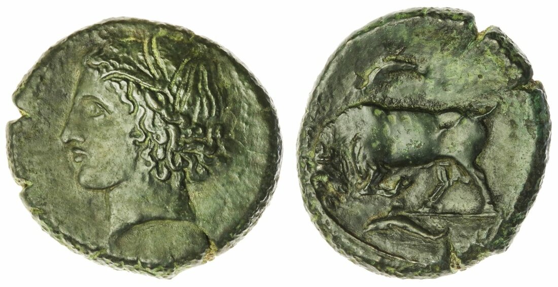 Sicily, Syracuse, Agothacles (317-289 BC), Æ Hemilitron, 24mm., struck c. 317-310 BC, head of Persephone or Kore left, wearing corn leaf, rev. Bull butting left, dolphin above and in exergue (Holloway, Bronze pp. 87; BAR issue 7; Calciati II, 96; SNG ANS 567), striking splits otherwise well centred, near extremely fine