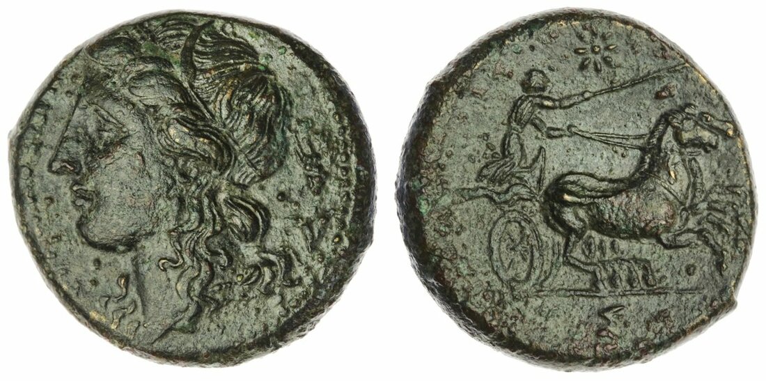 Sicily, Syracuse, Hiketas II (287-278 BC), Æ 23mm., wreathed head of Kore left, rev. Charioteer driving biga right (Calciati II, no. 127; HGC 2, 1446), some rougher surfaces, otherwise very fine