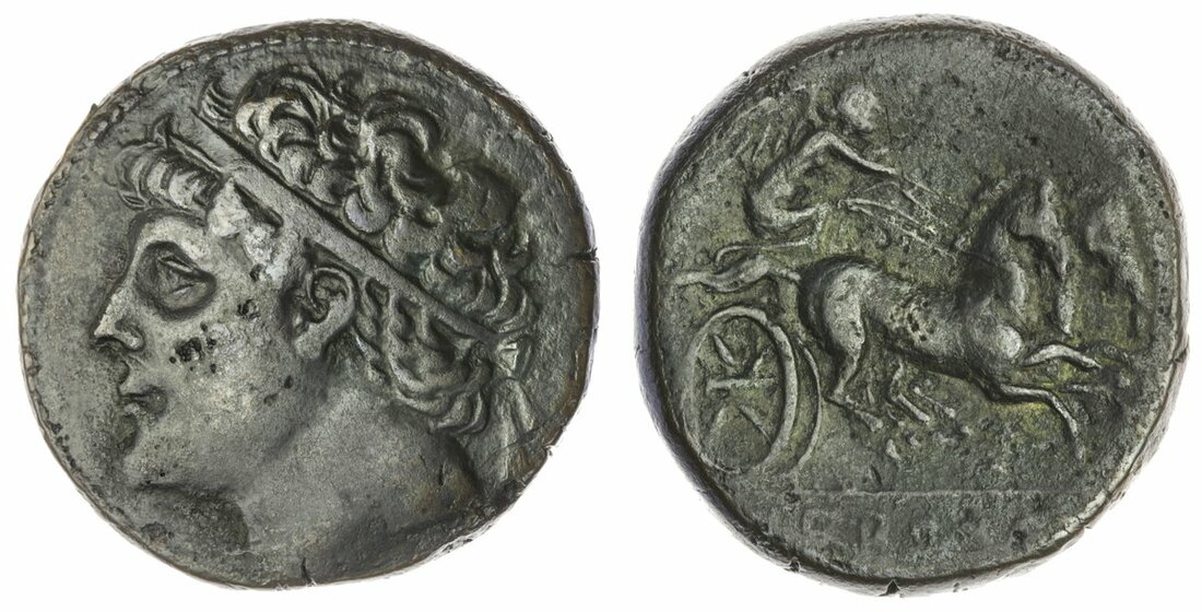 Sicily, Syracuse, Heiron II (275-215 BC), Æ Tetralitron, 34.5mm., diademed head of Heiron left, rev. Nike driving biga right, holding kentron and reins, [N below] (BMC 578; BAR Issue 74; HGC 2, 1546), brown patina, about very fine, very rare
