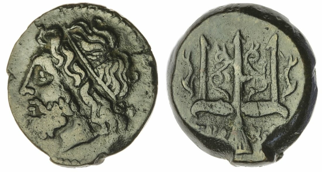 Sicily, Syracuse, Heiron II (275-215 BC), Æ Litra, 18mm., struck c. 263-218 BC, laureate head of Poseidon left, rev. trident head flanked by dolphins (Calciati pp. 197, no. 17; BAR Issue 60; HGC 2, 1550), trace of flan casting spigot, otherwise very fine