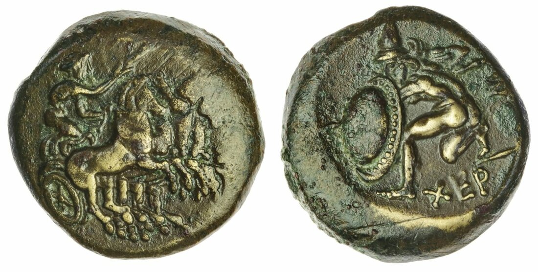 Tauric Chersonesos, Chersonesos (c. 350-330 BC), Æ 20mm., Artemis Parthenos, holding kentron and reins, driving fast Quadriga right, rev. nude warrior kneeling left, XEP below (Anokhin 1980, 35-43; SNG Stancomb 464; SNG BM Black Sea 739; HGC 3, 2080), off-struck with spots of verdigris, otherwise brassy patina, a bolder very fine, very rare