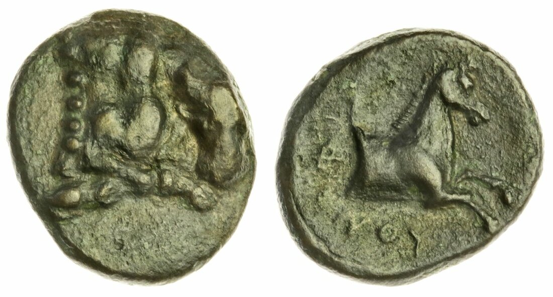 Thessaly, Pherai, temp. Teisiphonos the Tyrant (358-353 BC), Æ 15mm., forepart protome of bull right, rev. forepart of horse right (Rogers, 'The Copper Coinage of Thessaly' (1932), nos. 527-530; BMC -. SNG Cop. -. SNG Delepierre -. SNG Evelpidis -. SNG Munich -), slightly off-struck otherwise very fine, very rare