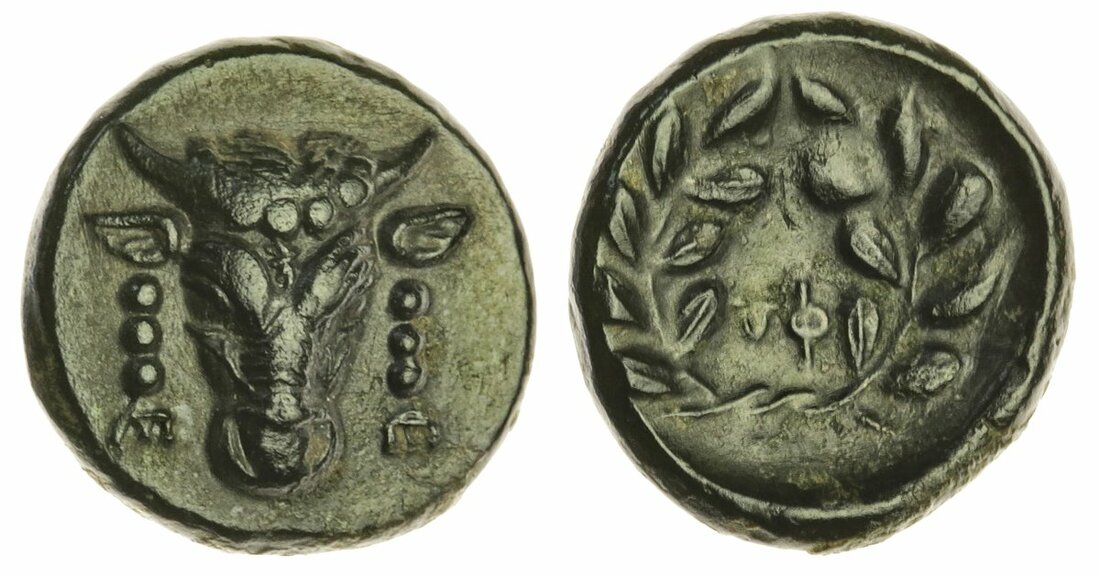 Phocis, temp. Philaikos (c. 357-346 BC), Æ 14mm., Federal Coinage, bucranium with sacrificial bandalettes beside, rev. 'FW' in laurel wreath (cf. BMC pp. 22, no. 94; cf. Laffaille 347; HGC IV, 1112; BCD Lokris-Phokis 288-89), beautifully centred with a rich dark patina, a pleasing extremely fine, an outstanding example, very rare in this condition