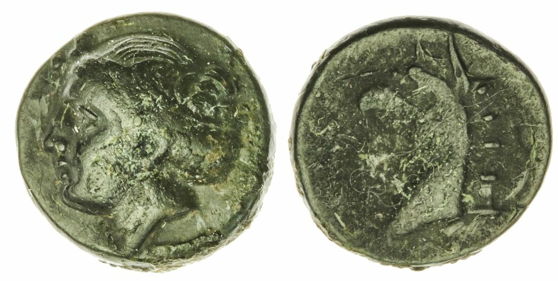 Phokaia (4th Century BC), Æ 11mm., head of Nymph (or Aphrodite ?) left, hair bound in sphendone, rev. Griffin head left (Klein 455; SNG Copenhagen 1031; SNG von Aulock 2135), some verdigris otherwise a dark green patina, very fine