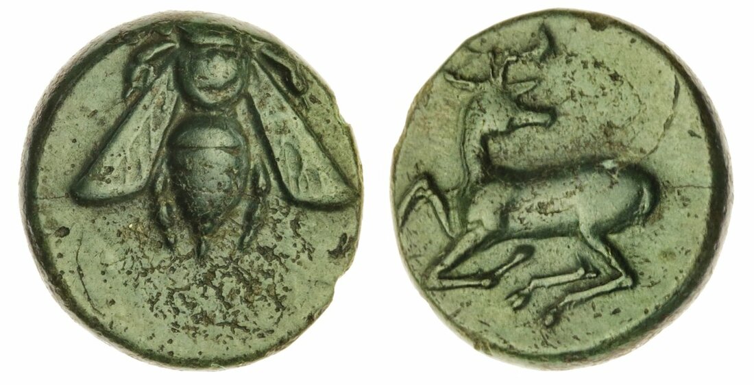 Ionia, Ephesos (387-295 BC), Æ 12mm., 12h, bee, rev. deer kneeling left, head backturned to right, rich green patina, somewhat off-struck on obverse, otherwise good very fine