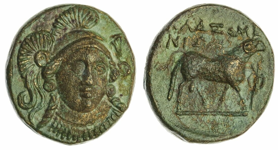 Ionia, Klazomenai (386-301 BC), Æ 17mm., helmeted head of Athena three-quarters right, rev. Ram walking right, thunderbolt in right field (SNG von Aulock 1993; SNG Munich 484; SNG Copenhagen 85), some corrosion to central devices, otherwise largely patinated, almost extremely fine