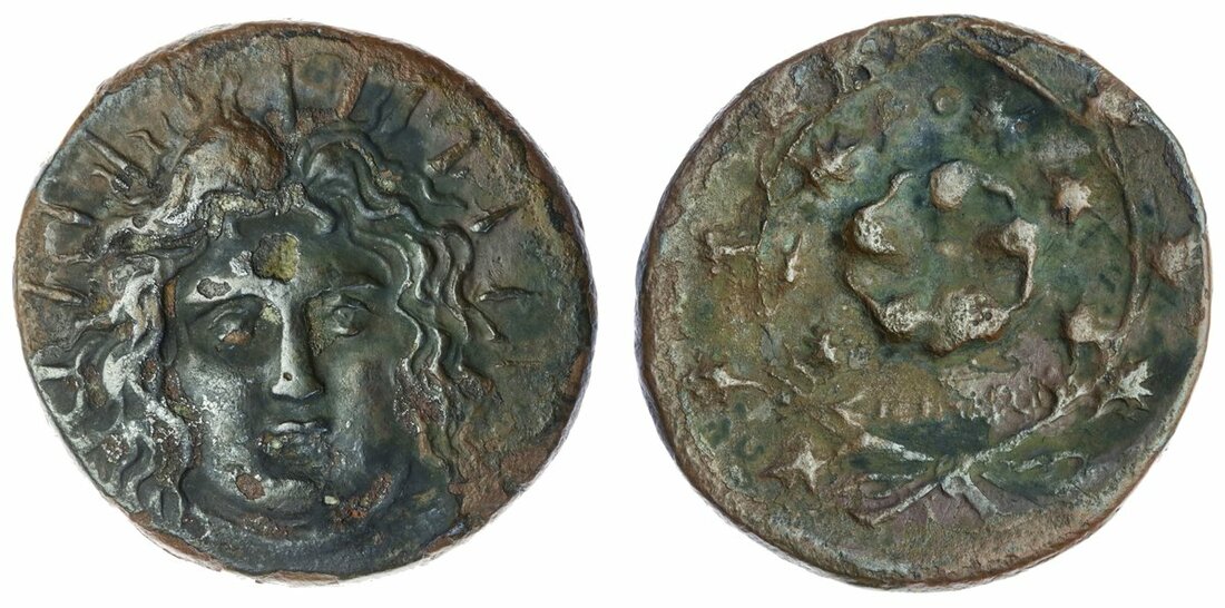 Carian Islands, Rhodes (88-43 BC), Æ 36mm., Zenon, magistrate, radiate head of Helios facing, rev. rose within oak wreath (BMC 343; SNG von Aulock 2842), some surface corrosion, otherwise about very fine