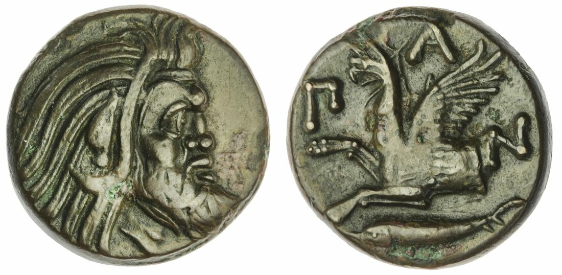 Cimmerian Bosphorus [Tauric Chersonesus], Panticapaeum (375-340 BC), Æ 20mm., head of Pan right, rev. P A N in field, forepart of Griffin to left, fish below (BMC 869; SNG Copenhagen 30), good very fine