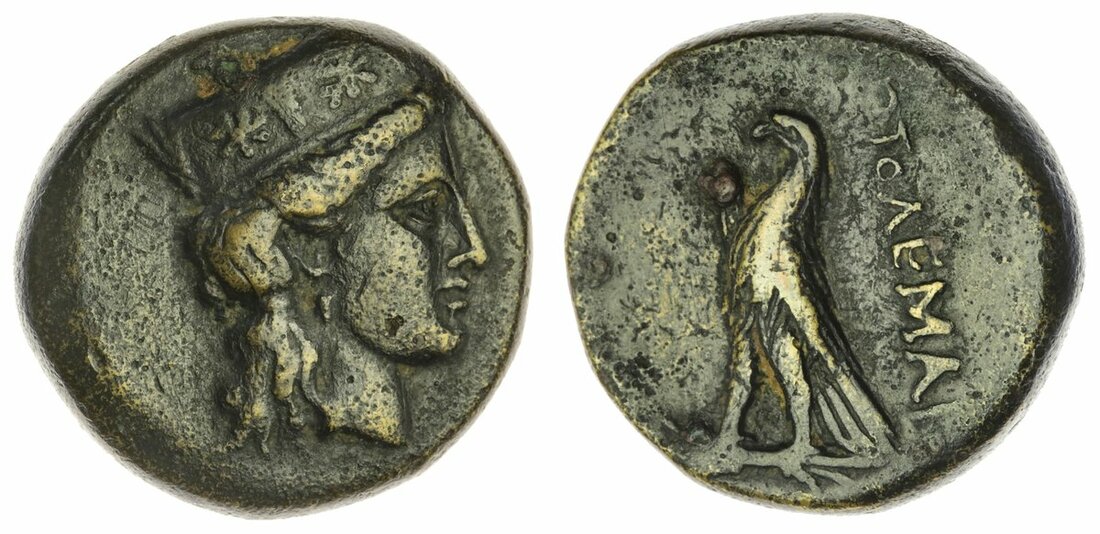 Ptolemaic Kingdom of Egypt, Ptolemy I Soter (305-282 BC), Æ Obol, 20mm., Paphos, head of Aphrodite Paphia right, wearing polos ornamented with palmettes, rev. Eagle with closed wings standing left, on thunderbolt (Lorber B118; Svoronos 74), rubbed, almost very fine, scarce