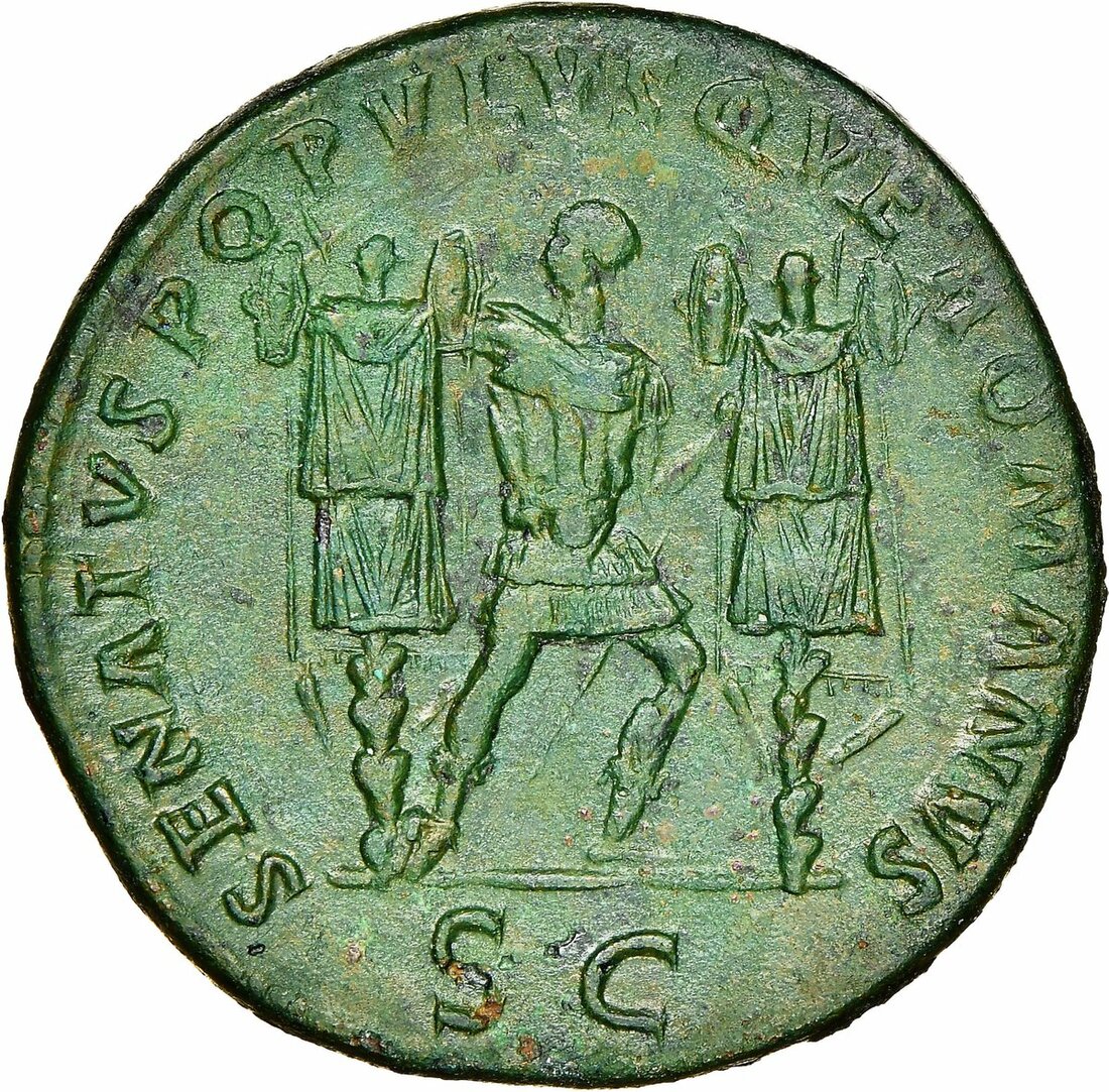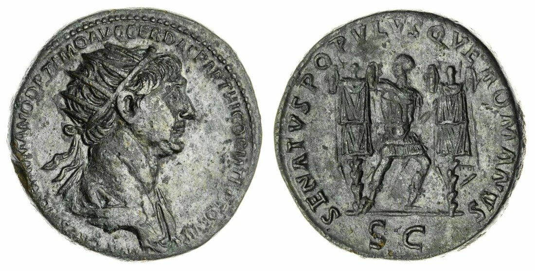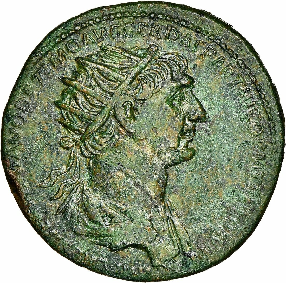 (x) Trajan (98-117), AE Dupondius, 13.40g, 6h, Rome, struck c. AD 114-117, IMP CAES NERVA TRAIANO OPTIMO AVG GER DAC PARTHICO P M TR P COS VIII, radiate and draped bust right, rev. SENATVS POPVLVSQVE ROMANVS, Trajan standing between two trophies, S. C. in exergue (RIC 676; RCV 3129; Cohen 356), even green patina with scattered spots of corrosion, otherwise a really bold very fine, scarce thus