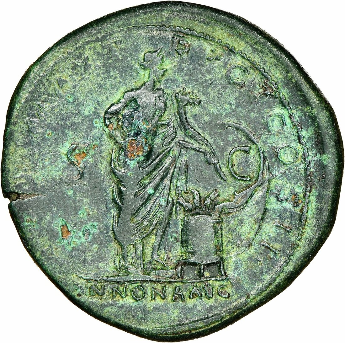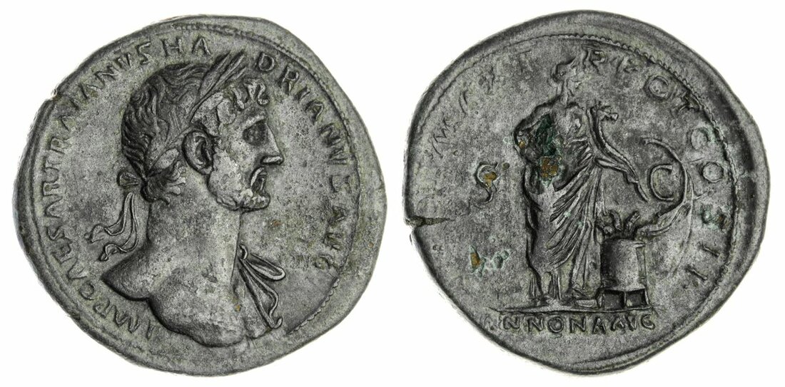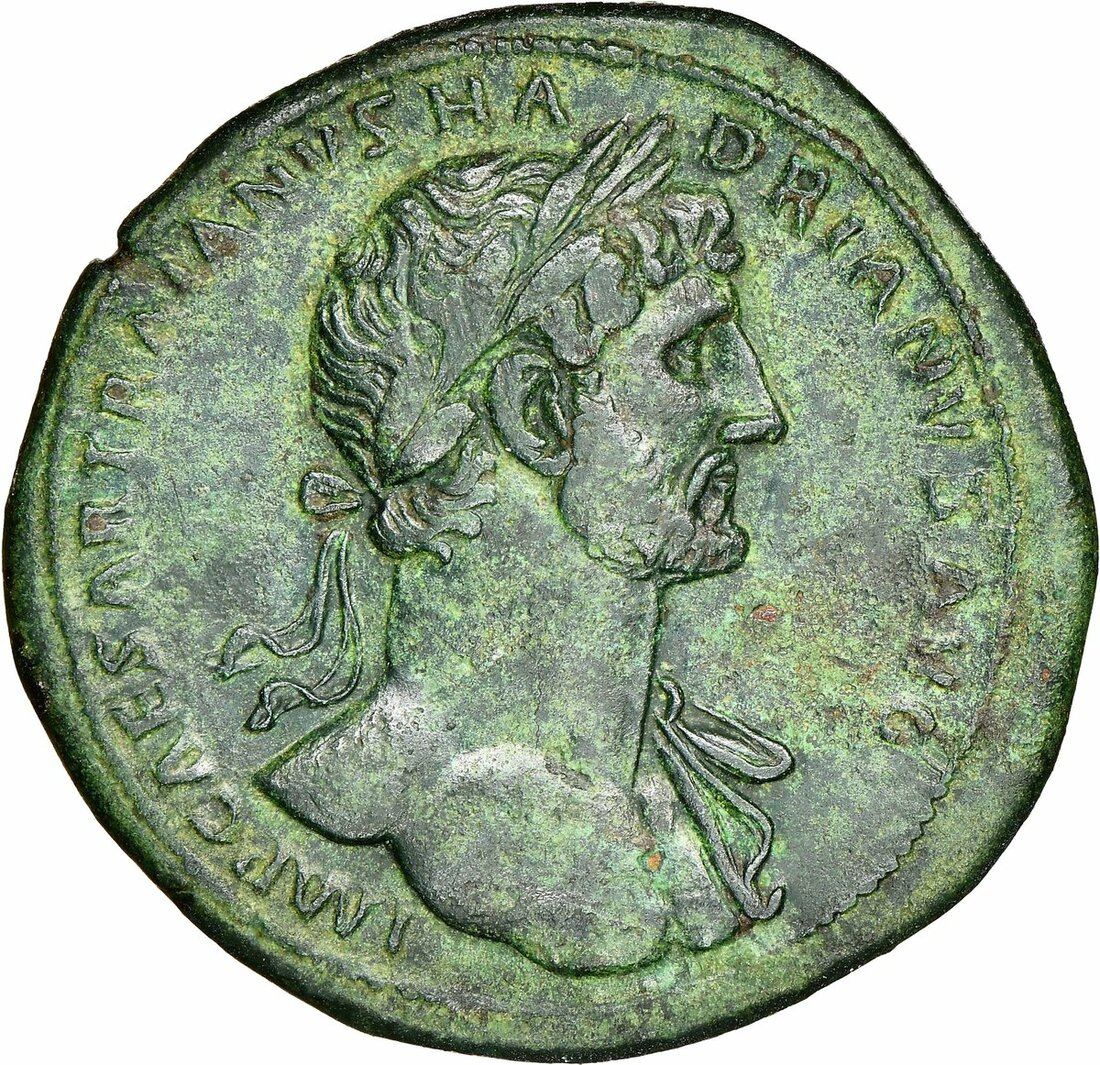 (x) Hadrian (117-138), AE Sestertius, 28.66g, 5h, Rome, struck AD 118, IMP CAESAR TRAIANVS HA-DRIANVS AVG, laureate head right, drapery over far shoulder, rev. [PO]NT MAX T-R POT COS II, Annona standing right with hand on hip and holding cornucopiae, modius with corn-ears and high prow before, S-C in field, ANNONA AVG in exergue (BMC 1125; RIC 549; Cohen 184), legend partly weak and some corrosion to centre of reverse, otherwise uniform green patina, the central devices bold, very fine or better, scarce